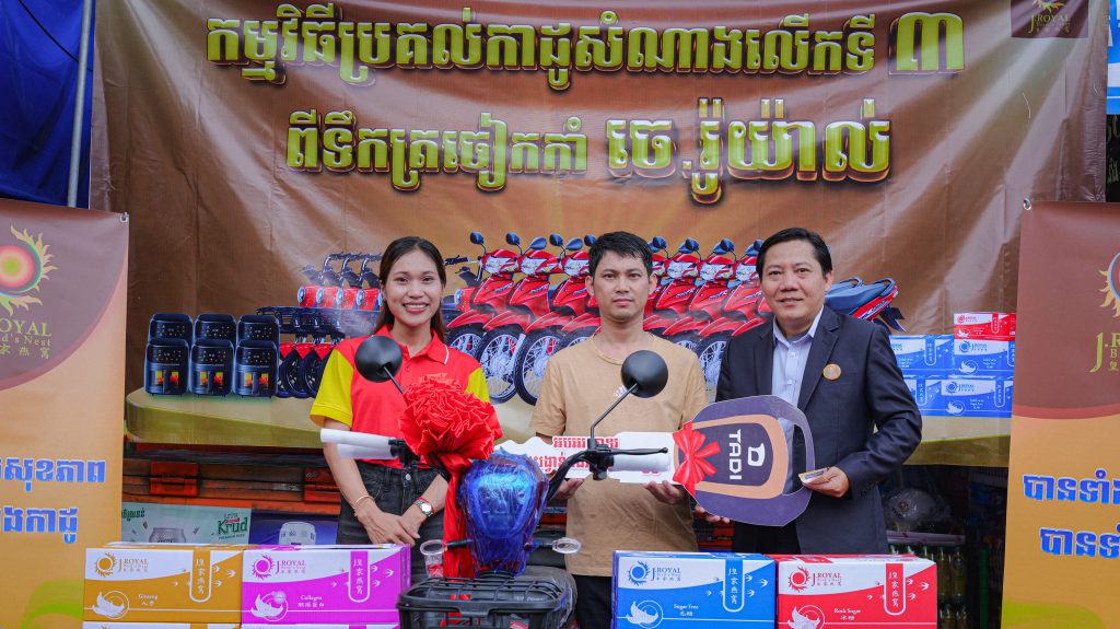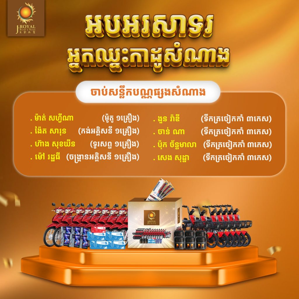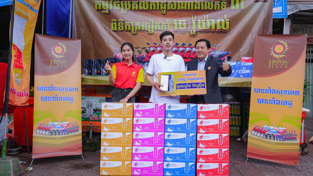 លោក ស៊ឹម សុភ័ក្រ ​ប្រធាន​ផ្នែក​ប្រតិ​បត្តិការ​ក្រុមហ៊ុន​ទឹក​ត្រចៀក​កាំ ​ចេ.រ៉ូយ៉ាល់ ​បញ្ជាក់ថា​ ក្រុម​ហ៊ុននឹង​បន្ត​ផ្ដល់​ជូន​​កាដូ​​សំណាង​សម្រាប់​អតិ​ថិជន​បន្ថែម​ទៀត ​ហើយ​ការ​ជូន​ដំណឹង​នូវ​គ្រប់​ Promotion​ កម្ម​វិធី​ពិសេសៗ ​នឹង​ផ្សព្វ​ផ្សាយ​លើ​ទំព័រ​ហ្វេសប៊ុក ​ទឹក​ត្រចៀកកាំ ​ចេ.រ៉ូយ៉ាល់ (J. Royal Bird’s Nest)។