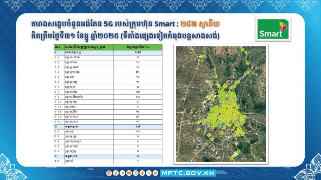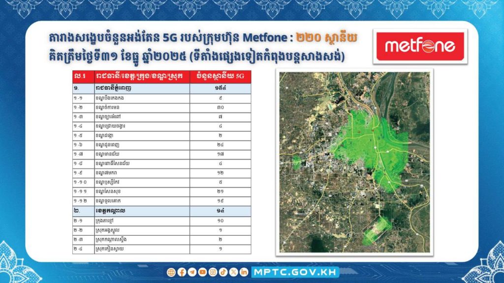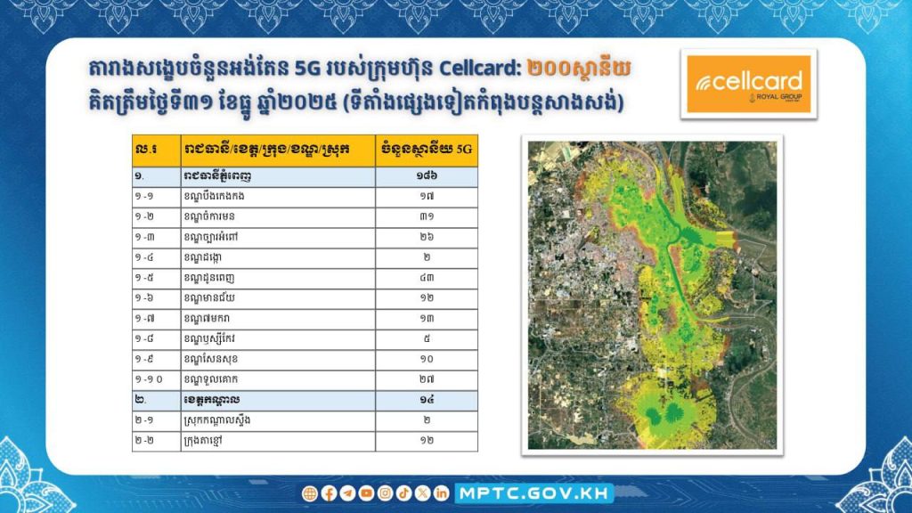 ក្រសួងប្រៃសណីយ៍និងទូរគមនាគមន៍ (ក.ប.ទ.) បានប្រកាសជាផ្លូវការដាក់ឱ្យដំណើរការប្រតិបត្តិការ សេវាទូរសព្ទចល័តជំនាន់ទី៥ ឬសេវា 5G នៅក្នុងព្រះរាជាណាចក្រកម្ពុជា ចាប់ពីខែមករា ឆ្នាំ២០២៦ តទៅ។ ក្នុងន័យនេះ ក.ប.ទ. បានសហការជាមួយគ្រប់ប្រតិបត្តិករទូរសព្ទចល័តធំៗទាំង ៣ គឺ ក្រុមហ៊ុន Cellcard (CamGSM) ក្រុមហ៊ុន Metfone (Viettel Cambodia) និងក្រុមហ៊ុន Smart (Smart Axiata) ជំរុញការសាងសង់ស្ថានីយអង់តែនទូរគមនាគមន៍និងបំពាក់ឧបករណ៍ផ្តល់សេវា 5G នៅតាមទីតាំងដូចមានផែនទីលម្អិតក្នុងឧបសម្ព័ន្ធជូនភ្ជាប់។