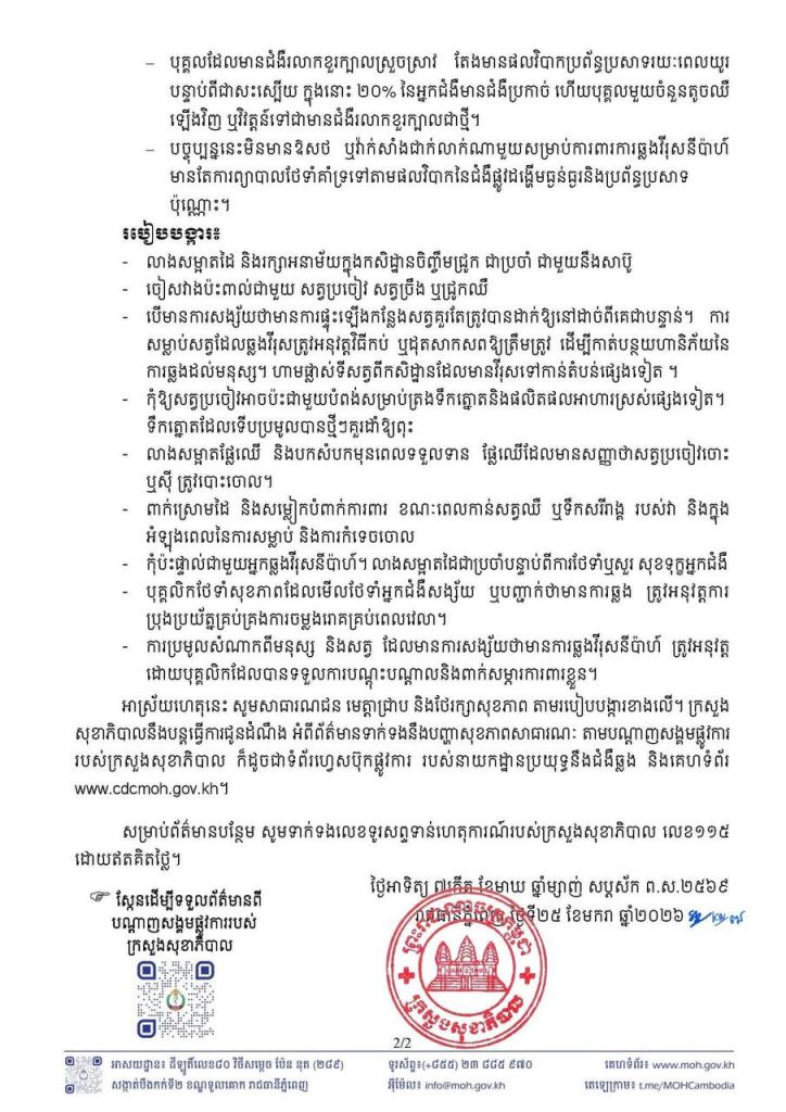 សូមបញ្ជក់ៈ រហូតដល់ពេលនេះ ប្រទេសកម្ពុជាមិនដែលរកឃេីញ ជំងឺ នីប៉ាហ៍ កេីតលេីមនុស្សនៅឡេីយទេ តែនាយកដ្ឋានប្រយុទ្ធនឹងជំងឺឆ្លង កំពុងយកចិត្តដាក់ធ្វេីការតាមដាន និងត្រៀមលក្ខណៈឆ្លេីយតបនឹងការរាត្បាតជំងឺនេះជាប់ជានិច្ច ។