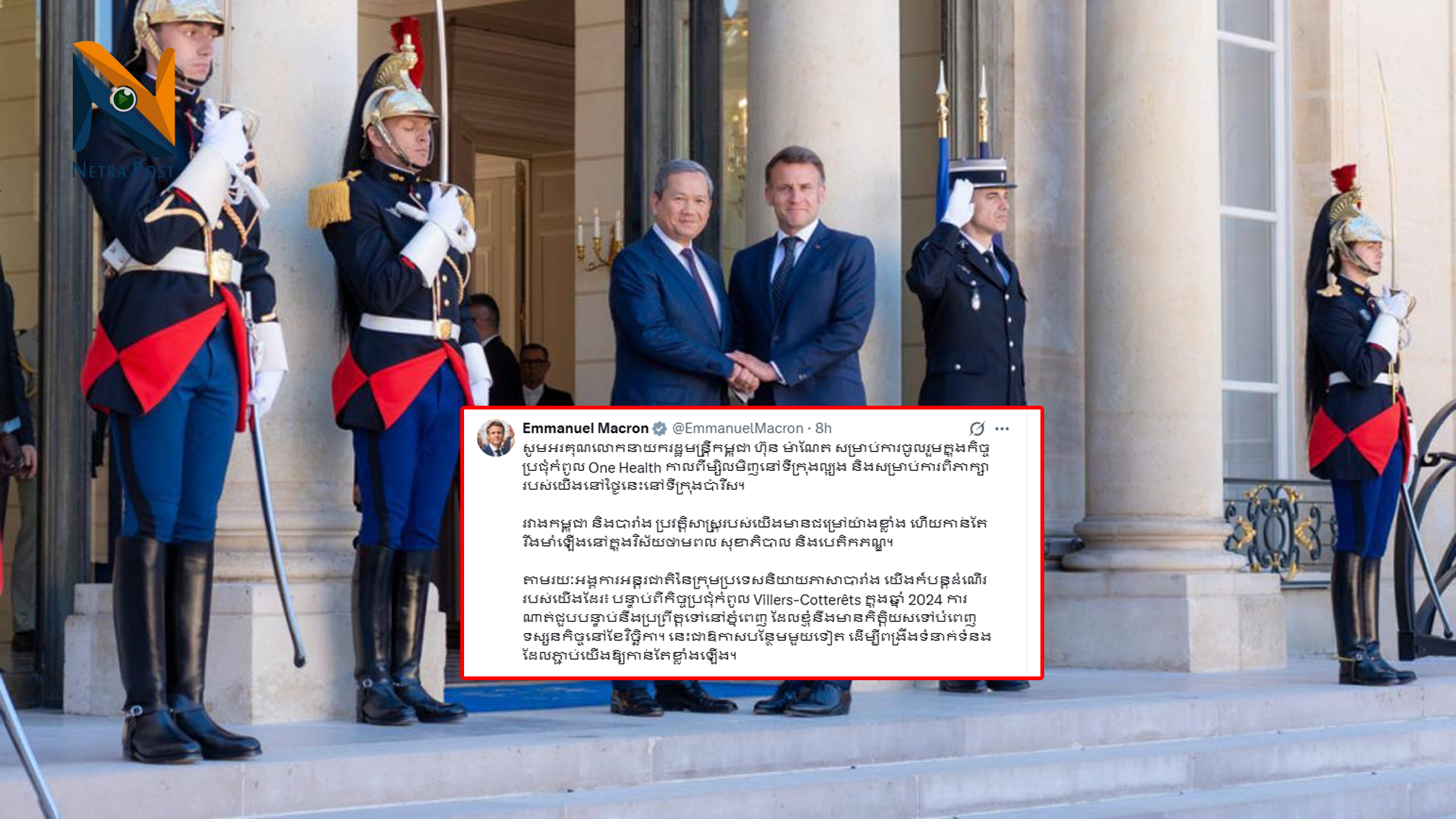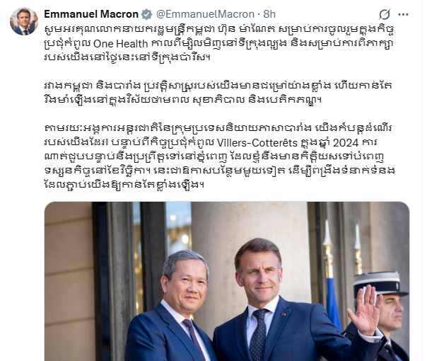 ប្រធានាធិបតី​បារាំង​លោក អេម៉ានុអែល ម៉ាក្រុង (Emmanuel Macron) បាន​សរសេរ​លើ​បណ្ដាញ​សង្គម X របស់​លោក​ថ្លែង​អំណរ​គុណ​នាយករដ្ឋមន្ត្រី​កម្ពុជា​ជា​ភាសាខ្មែរ និង​បានបញ្ជាក់​ពី​ចំណង​ទំនាក់ទំនង​ដែល​កាន់​តែ​រឹង​មាំ​រវាង​បារាំង​ និង​កម្ពុជា​។